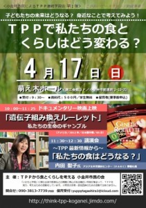 小金井市民によるTPP連続学習会を開催!(4/17、5/14) 「関税撤廃によって輸入品が安く手に入る」と、消費者にとってのメリットが謳われるTPP。 一方、農畜産業だけでなく、食の安全や医療、雇用、投資、保険、公共サー […]