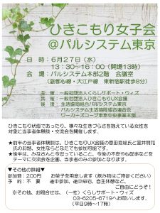 【終了】6/27(水)ひきこもり女子会@パルシステム東京 前半は女性ならどなたでも。後半は当事者のみ参加可能です。