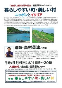 『地域人』創刊3周年を記念し、スローフード運動の先駆者である作家の島村菜津氏を講師にお迎えし、“暮らしやすい町・美しい村~ニッポンとイタリア”というテーマでお話しをうかがいます。ぜひお立ち寄りください!詳細は下記をクリッ […]