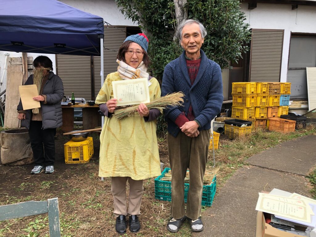 最後に、脱穀機はそうじをしてパーツを折りたたみ、元あった納屋に納め、眞壁さんがいれてくれたお茶で小昼タイムです。ずっと見守ってくれていた先代のおばあちゃんもいっしょに談笑し、稲を実らせてくれたお天道さまとわき水、そして機械のありがたみを実感した半日となりました。