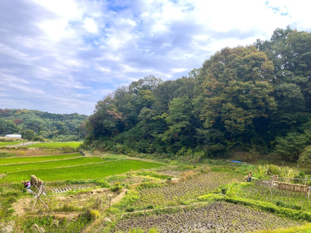 なだらかな山々はまだ紅葉シーズン手前。それでも、空は広く、刈り取られた田んぼの風情はうるわしく……、清々しい空気にまず深呼吸しました。「この棚田を借りられたのは、ラッキーだったよ。3段目の、真ん中と道路側が私たちの作ってる田んぼで、面積はどのくらいかなあ? 1アールくらいかな?」と藤宮さん。