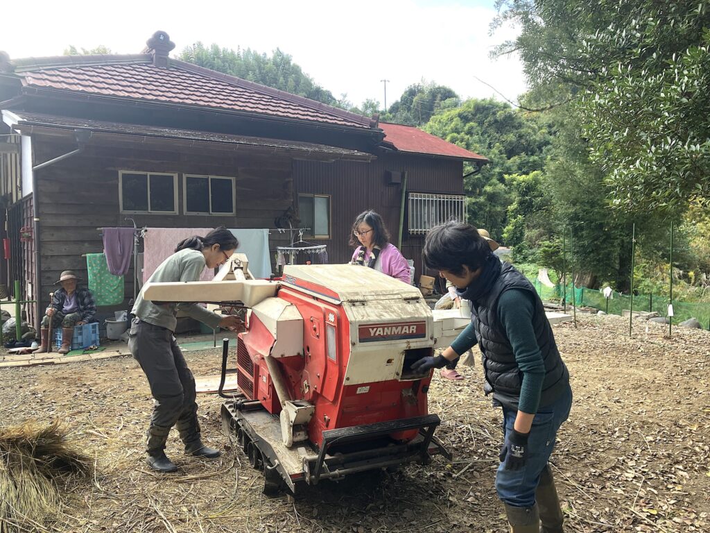 2時間半ほどで、あっという間に脱穀し終えることができました。実は、この日の田んぼ仲間に脱穀機を扱える人がおらず、協力者を探すもお天気の都合、それにメンバーと日程調整ができず、まずエンジンをかけるところから手探りでした。足踏み脱穀機で脱穀をした知り合いは1日がかりだったという話も出て、力を合わせて無事機械での脱穀が終わったのはなによりなのでした。