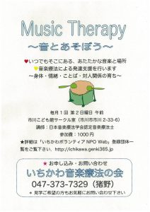 「音とあそぼう」いちかわ音楽療法の会 いつでもそこにあるあたたかな場所と時間をモットーに、音楽療法によるお子様の発達支援を行います。 ◆毎月第2日曜日午前中 ◆市川公民館第1研修室(JR総武線市川駅北口より徒歩2分) […]